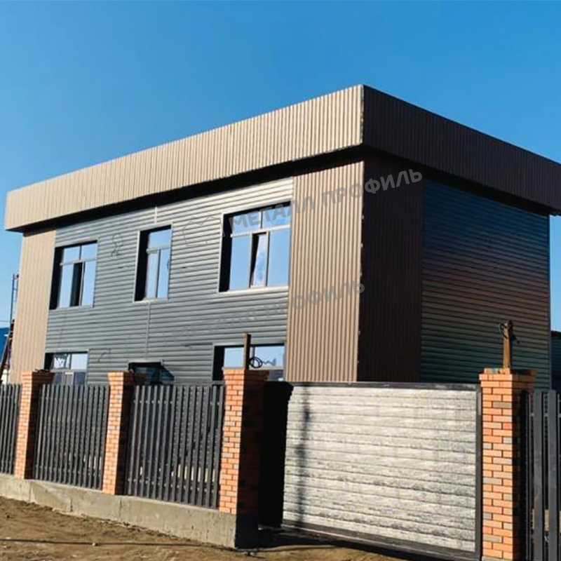 Профилированные стальные панели толщиной 0,5 мм с цинковым слоем и полимерным покрытием «Полиэстер» — это современный материал для фасадной облицовки. Благодаря защитному покрытию сайдинг устойчив к коррозии, перепадам температур и воздействию ультрафиолета, а здание, отделанное им, выглядит аккуратно и эстетично. Металлосайдинг — это практичное, долговечное и актуальное решение для оформления фасада.